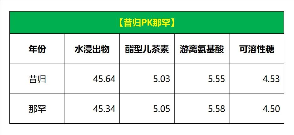 可以看到,四個指標數(shù)據(jù),那罕和昔歸都差不多,這也是為何新茶的口感差異不大,但也有些茶友會說他們明顯喝出不一樣,那要看陳化的效果,老茶對比就太多因素了