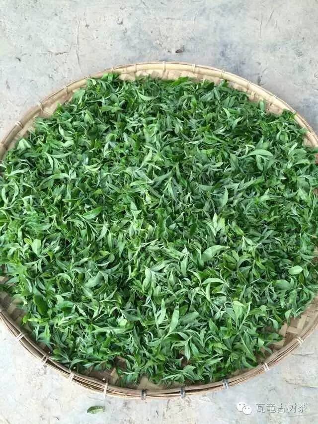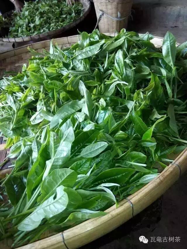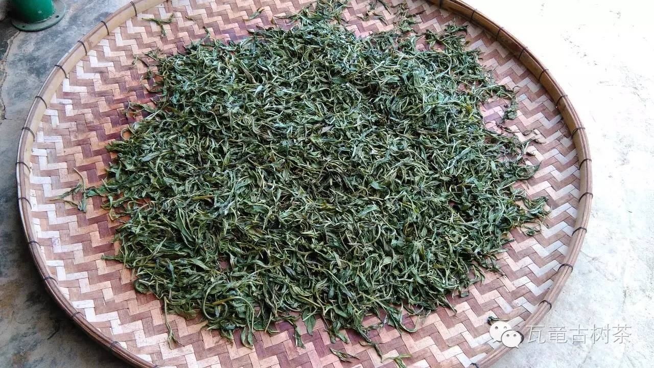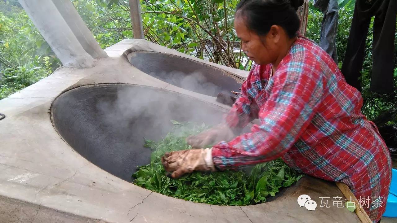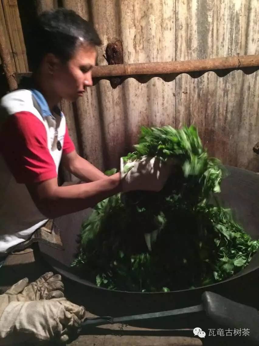 三、殺青:瓦竜古樹茶和其他普洱茶一樣也是采用鍋炒殺青,因大葉種含水量高,殺青時必須悶抖結合,使茶葉失水均衡。